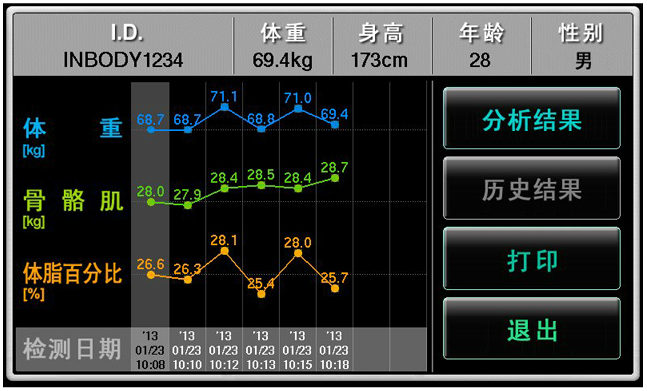 - LCD屏幕上的身体成分趋势变化的历史检测