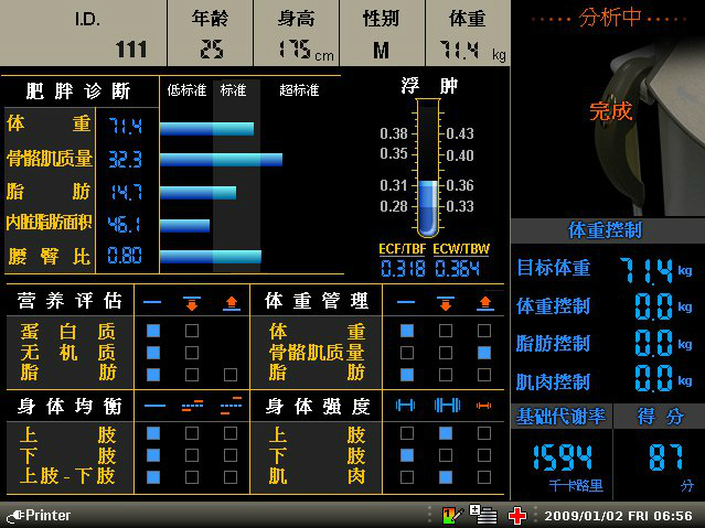 浮肿指数,节段性浮肿指数, 内脏脂肪面积(18岁以下未成年人显示成长曲线)营养评估(蛋白质,无机盐,体脂肪), 均衡分析,身体力量,健康诊断, 目标体重,体重控制脂肪控制,肌肉控制,健康评估,